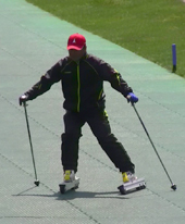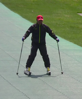 3.内側の用具(写真右足)がフラットになる。この時、外脚(写真左脚)の角度が変わらないようにしながらバランスをとる。 |